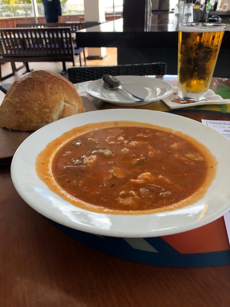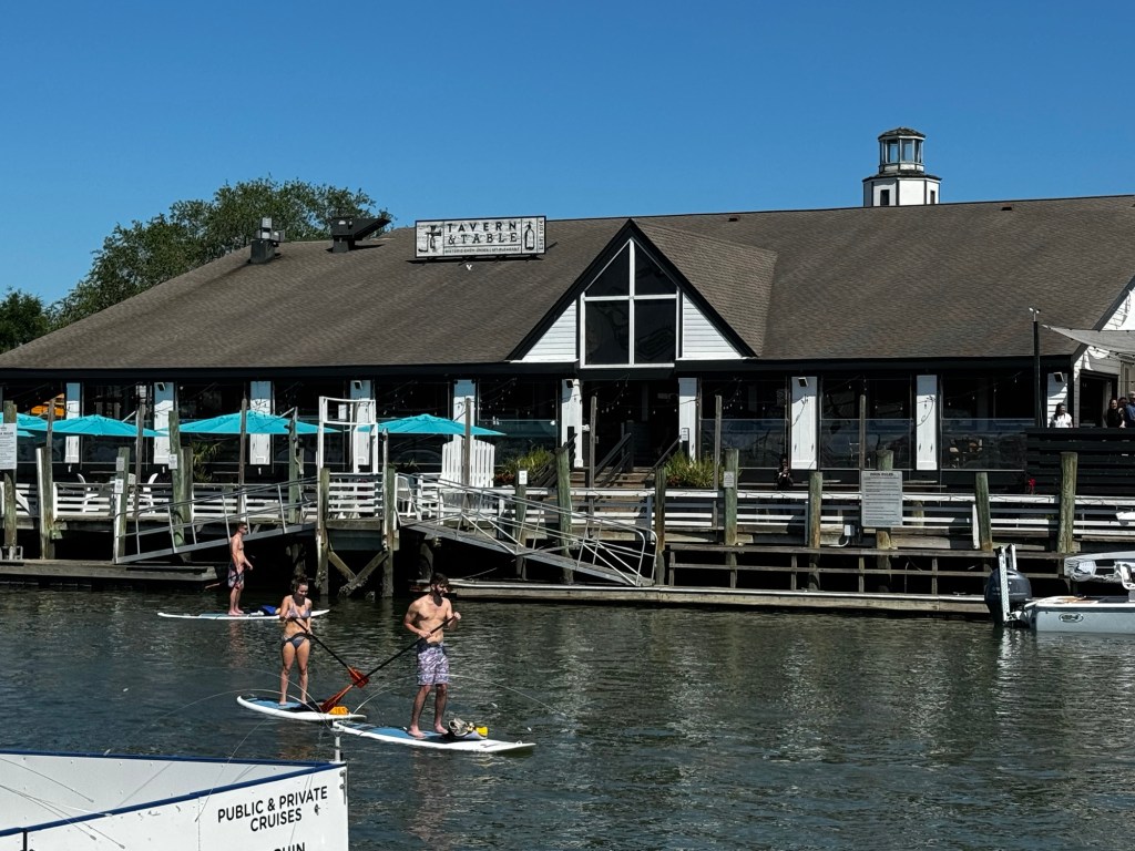 So we walked the bridge across to Tavern and Table and agreed to order some apps until 4p when Water’s Edge patio opened for dinner. Tavern and Table in pic below with standup paddleboarding folks on Shem Creek.